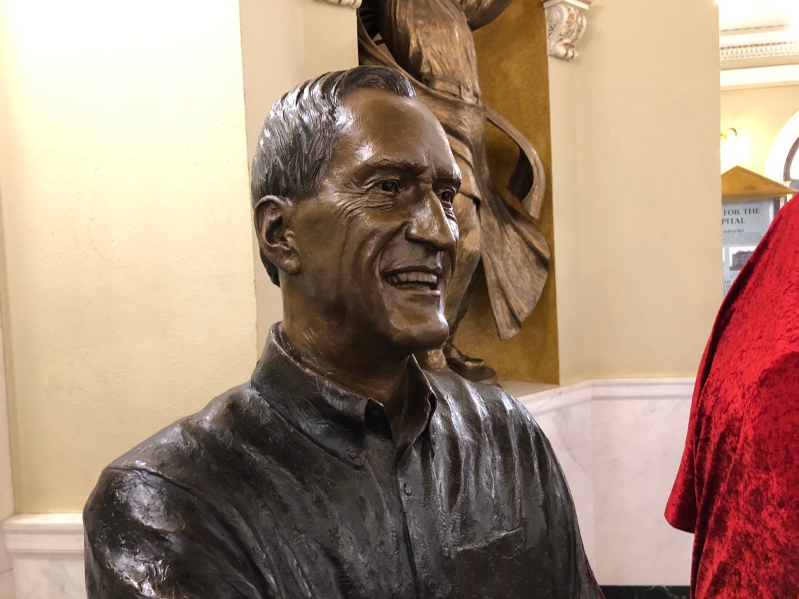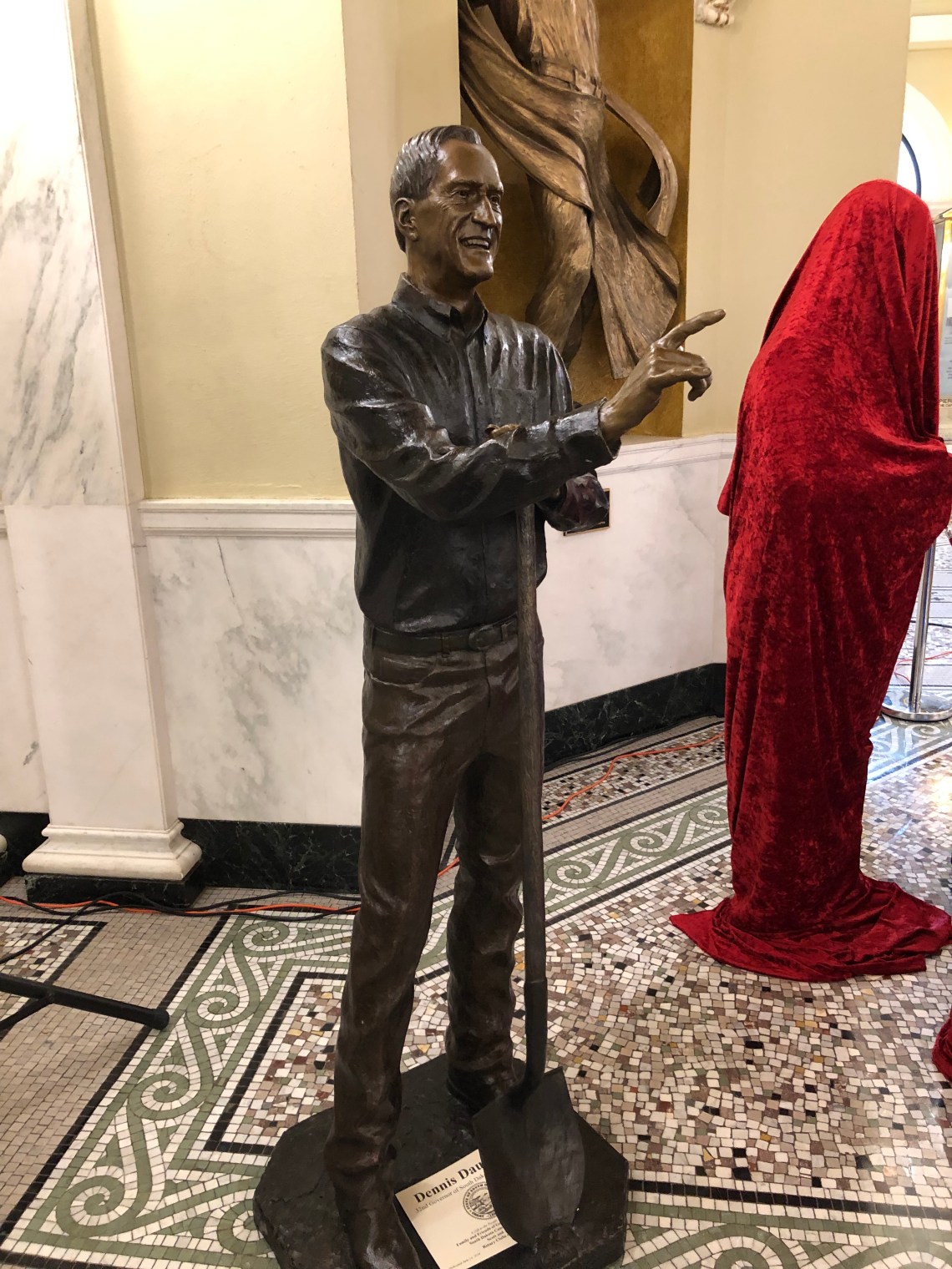 Gov. Daugaard’s statue, by James Michael Maher, portrays Daugaard, the son of deaf parents, signing “I love you.” In his other hand, he is holding a shovel, recalling his leadership during the 2011 Missouri River floods and his emphasis on stewardship. That hand is also literally “pinching a penny.”