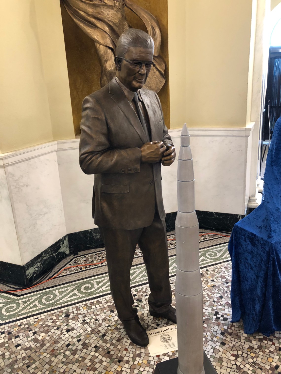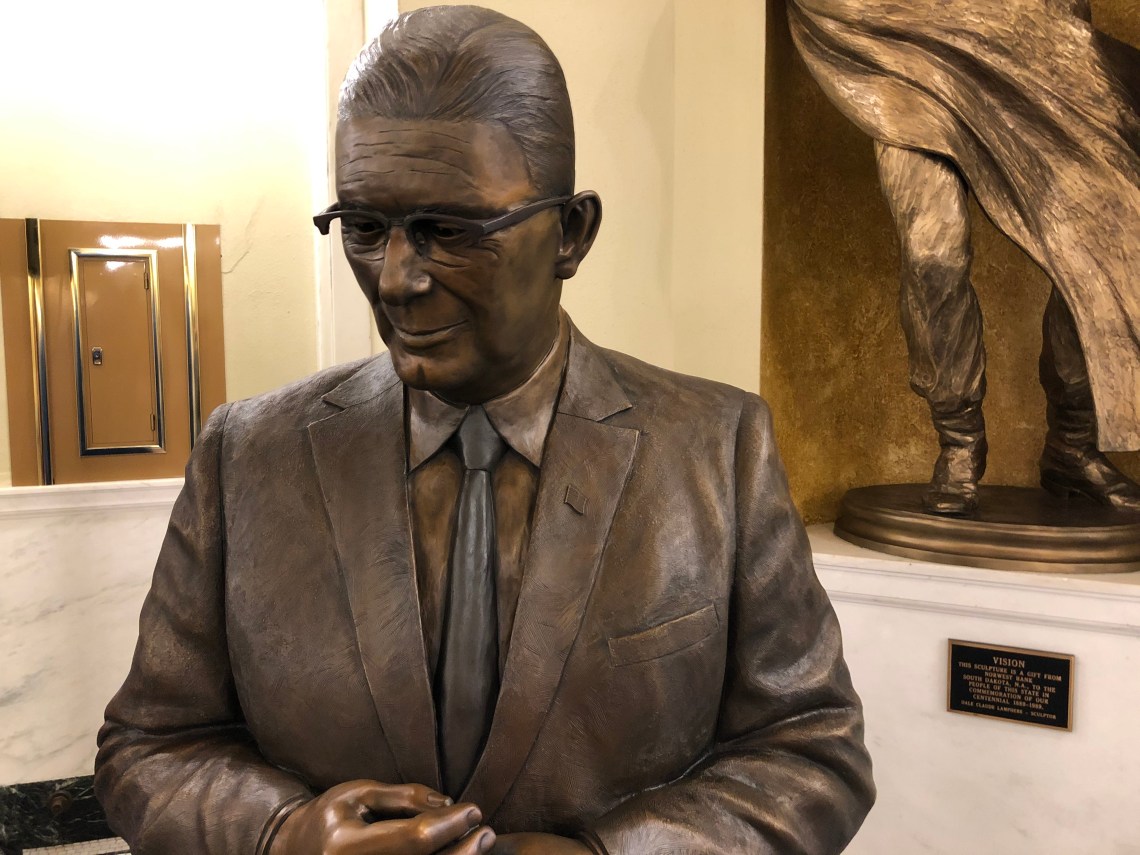 Gov. Gubbrud’s statue, by Lee Leuning and Sherri Treeby, portrays Gubbrud observing a model of a Minuteman Missile, dozens of which were installed in SD during his tenure.