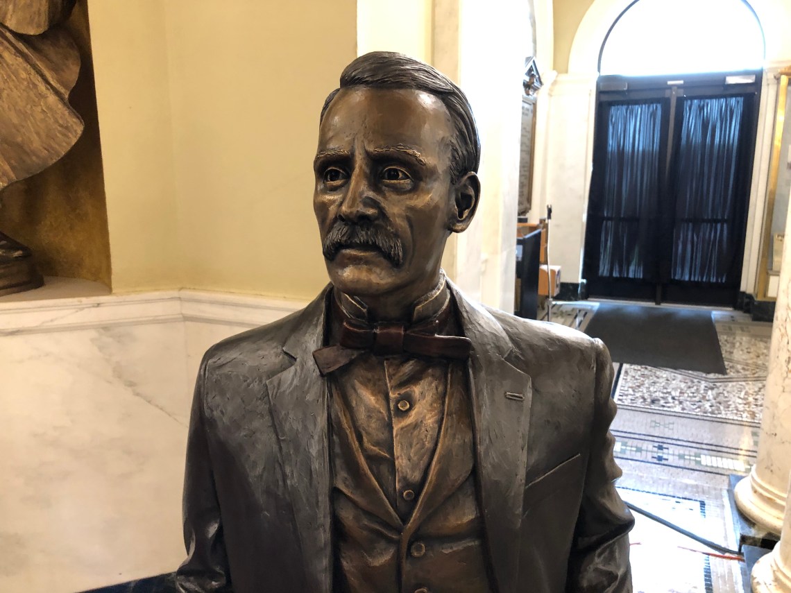 Gov. Elrod’s statue, by James Van Nuys, emphasizes Elrod’s profession as an attorney.