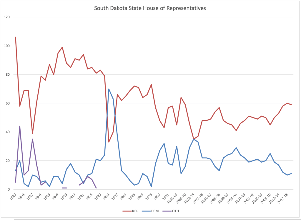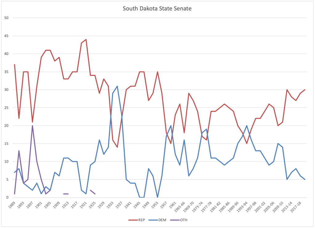 - In 1958, Democrats took the Senate 20-15 as Democrat Ralph Herseth won the governor’s office. Republicans retained control of the House, and in 1960 House Speaker Archie Gubbrud defeated Herseth for reelection.