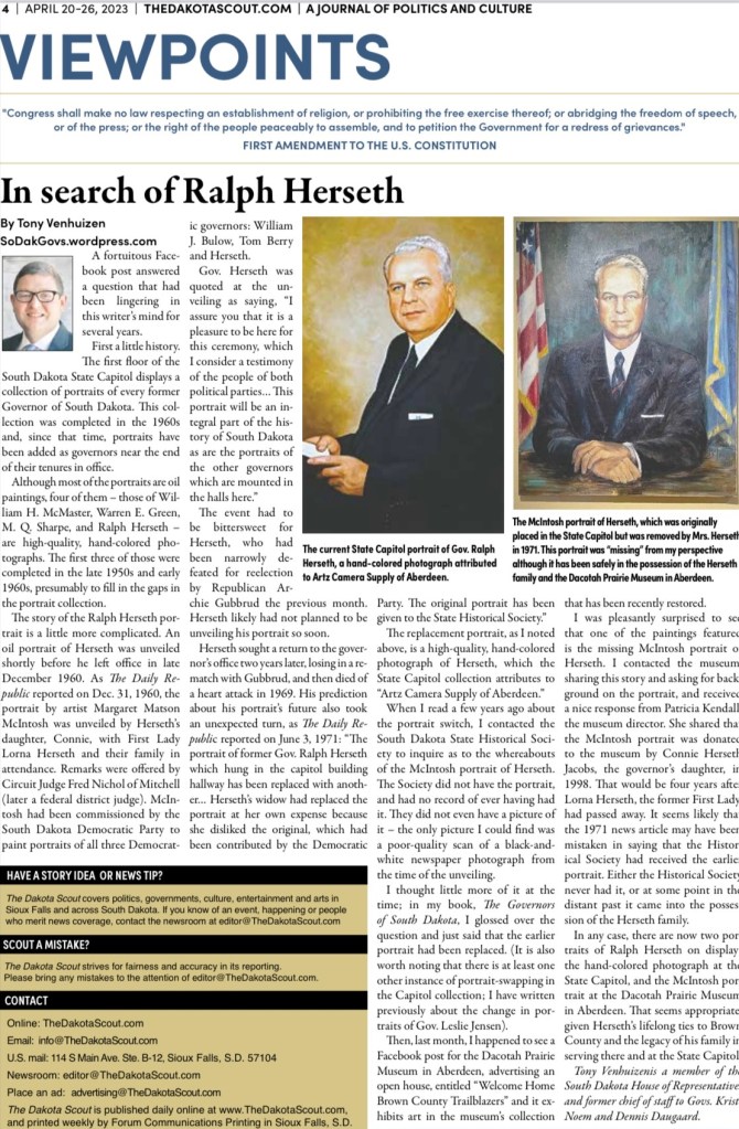 Another issue of The Dakota Scout has hit the newsstands, once again featuring content from this blog. The April 20-26, 2023 includes this blog’s recent post on my recent discovery of the “missing” portrait of Gov. Ralph Herseth, which it turns out is safely in the hands of the Dacotah Prairie Museum in Aberdeen.