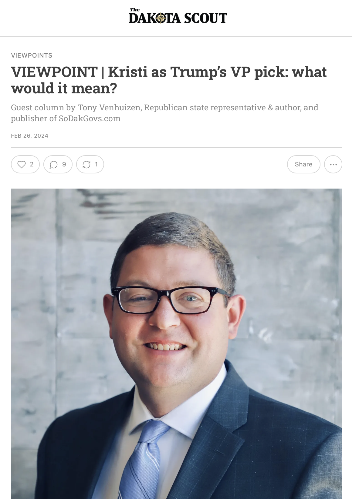 The Dakota Scout is once again featuring content from this blog. Yesterday, the online edition posted an updated version of a this blog’s post from last fall about the possibility of Kristi Noem being selected to be Donald Trump’s running mate. Check it out!