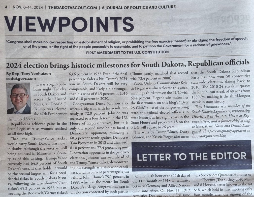 Another issue of The Dakota Scout has hit the newsstands, once again featuring content from this blog. The November 8-14, 2024 includes this blog’s recent post on the big wins in South Dakota for Dusty Johnson, Kristie Fiegen, and the Trump/Vance presidential ticket. Check it out on newsstands.